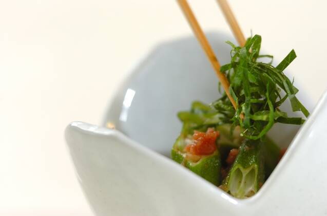 ボウルでオクラと梅干しを和えて器に盛り、大葉をのせる。