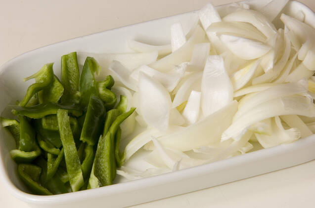 玉ネギは縦半分に切り、1cm幅のクシ切りにする。ピーマンは縦半分に切りヘタと種を取って、玉ネギ位の大きさに切る。<合わせ調味料>を混ぜ合わせる。
