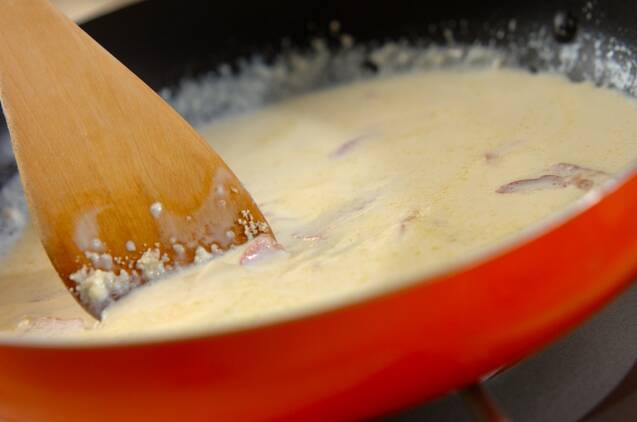 生クリーム、牛乳を加え、塩とパルメザンチーズ(分量から大さじ3)を加えてやさしく混ぜる。