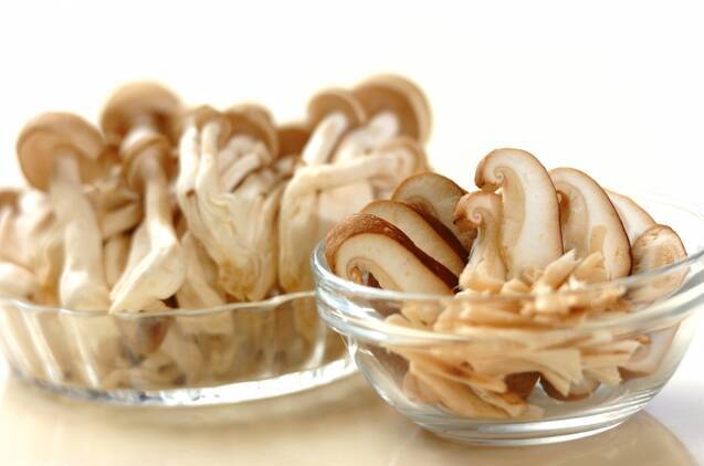 <ステーキソース>の材料を混ぜ合わせる。<キノコソテー>のシイタケは石づきを取り、厚さ5mmの薄切りにする。シメジは石づきを切り、小房に分ける。