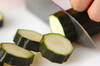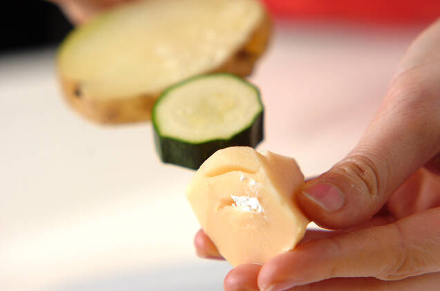 ジャガイモは皮ごと幅1.5~2cmの輪切りにし、ズッキーニ、水煮タケノコと共に串に刺す。