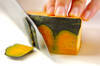 カボチャは種とワタを取り除き、包丁で皮を削ぎ落とし、1cm角に切る。