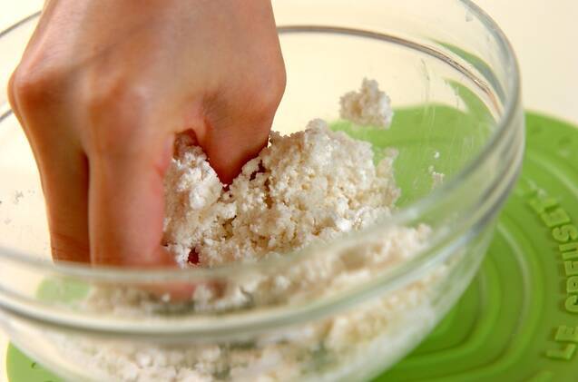 白玉粉に牛乳を少しずつ加えて、耳たぶ位のかたさになるまで練り合わせる。