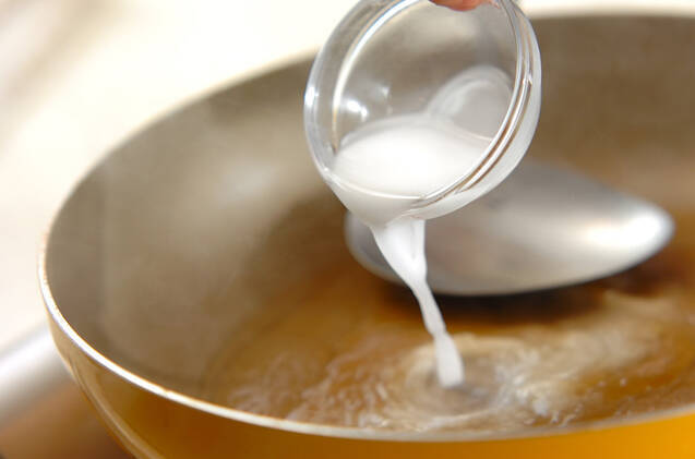 (2)のフライパンに<合わせだし>の材料を加え、固形チキンスープの素が煮溶けたら、塩コショウで味を調える。<水溶き片栗>をまわし入れ、トロミがついたら(2)にかける。