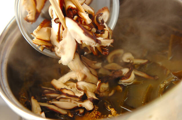 <合わせだし>の他の材料と、シイタケ、シメジを加え強火にする。煮たってきたらアクを取り、中火で煮汁が半量くらいになるまで30~40分煮込む。途中、木ベラで全体を混ぜて下さい。