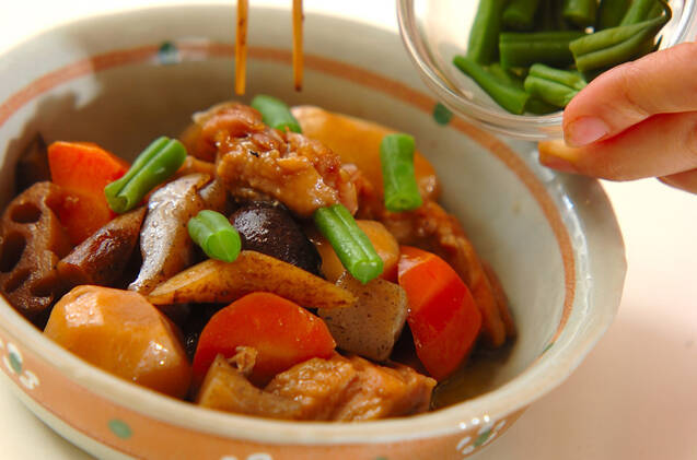 鍋の蓋を取り、火を強めて汁気が少なくなるまで煮含める。器に盛り、サヤインゲンを散らす。