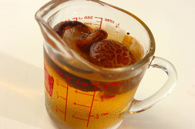 シイタケはぬるま湯でもどし、石づきを落として半分に切る。もどし汁は網を通し、200mlに足りない場合は水を足す。