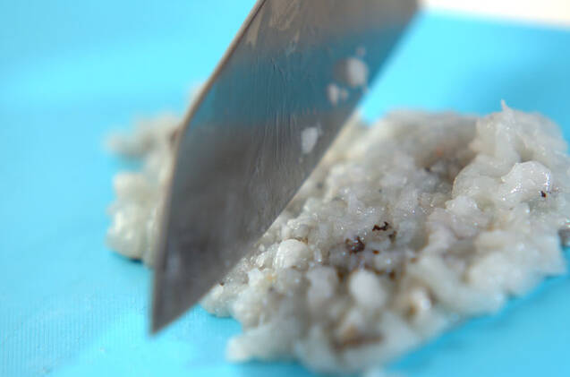エビは殻を取り、厚みを半分に切って背ワタを取り除き、塩水で洗って水気を拭き取る。粗めのペースト状になるまで包丁で叩き、<調味料>の材料をよく混ぜ合わせる。