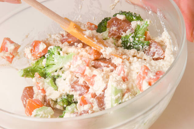 <和え衣>とブロッコリー、ニンジン、コンニャクを混ぜ合わせ、器に盛る。