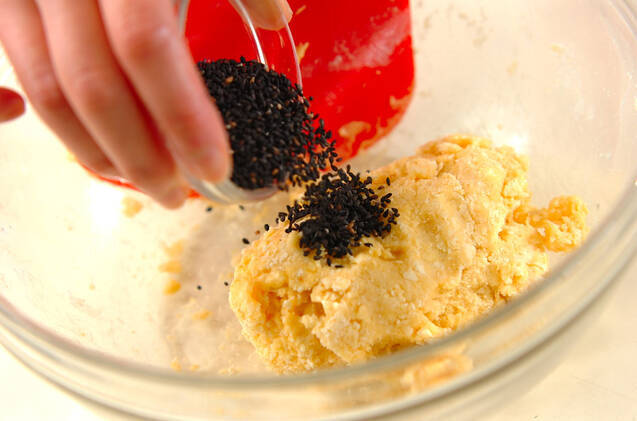 (1)に溶き卵を数回に分けて加え、カードおさえながらまとめる。さらに黒ゴマを加え、まとめる。