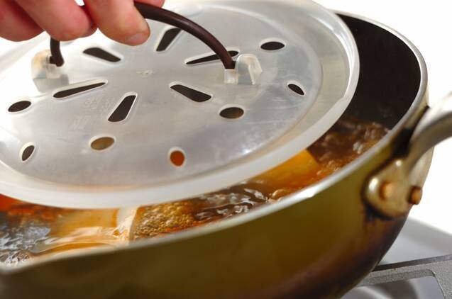 鍋に<調味料>の材料と(1)のサバを入れ、強火にかける。沸騰したら落とし蓋をし、水分量が半分になるまで強火で煮る。