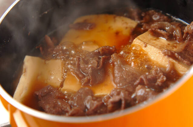 アクを取り、木綿豆腐を加えて落とし蓋をして10分煮る。