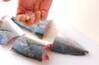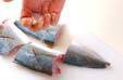 ツバスの切り身を並べ、手に塩を持ち、20~30cm位上で指の隙間から塩を落としながら、裏表全体にまんべんなく振り掛ける。(振り塩)