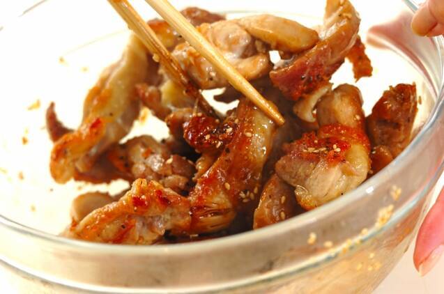 (1)とサラダ菜、プチトマト、キュウリによく混ぜた<調味料>の材料をからめ、お皿に盛り付ける。