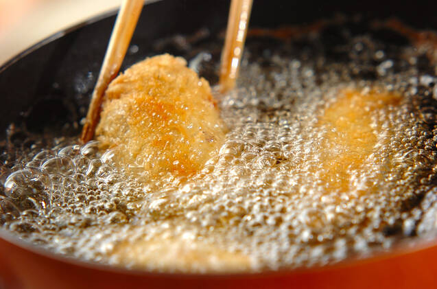 (1)に<衣>の小麦粉を薄く付け、溶き卵、パン粉と順につける。170℃の揚げ油に入れ、色よく揚げる。