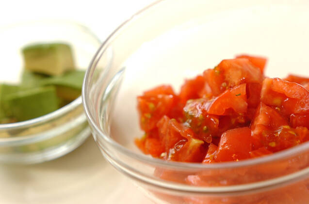 トマトはヘタをくり抜いて熱湯にサッとくぐらせ、皮をむいてザク切りにする。アボカドは種と皮を取り除き実をひとくち大に切る。ツナは汁気をきっておく。ボウルでトマト、アボカド、ツナ、レモン汁、麺つゆを合わせ、冷蔵庫で冷やしておく。