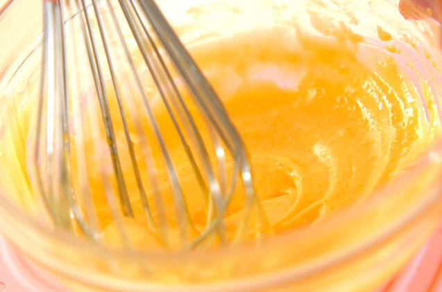 ボウルに卵黄、砂糖を入れて白っぽくなるまでよく混ぜ、牛乳、生クリーム、バニラオイルを加える。