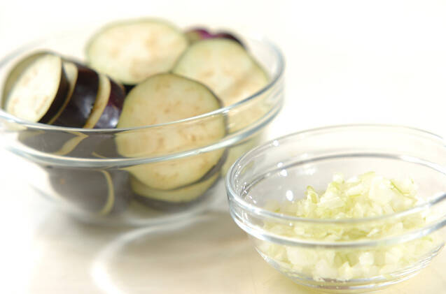 ナスはヘタを切り落とし、幅1cmの輪切りにする。
