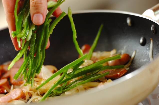 (1)のフライパンにピーマンを加えて軽く炒め、(2)のスパゲティーと<調味料>の材料を加えて炒め合わせる。器に盛り、粗びき黒コショウと粉チーズを振る。