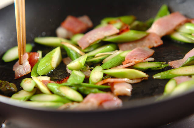 フライパンにオリーブ油、ニンニクを弱火で熱し、ニンニクの香りがたってきたらベーコン、グリーンアスパラを少ししんなりするまで炒める。