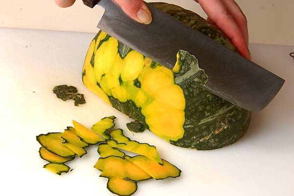 カボチャは種とワタを取り、所々皮をそぎ落として、大きめのひとくち大に切る。水に放ち、ぬれたままラップでふんわり包んで、電子レンジで5~6分加熱する。