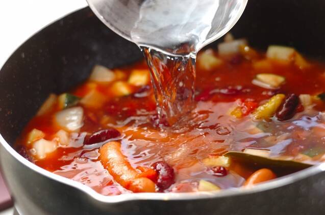 玉ネギが透き通ったら、ソーセージ、キドニービーンズ、<トマトソース>の材料を加え、蓋をして15分程煮る。器に盛り、パセリを散らす。