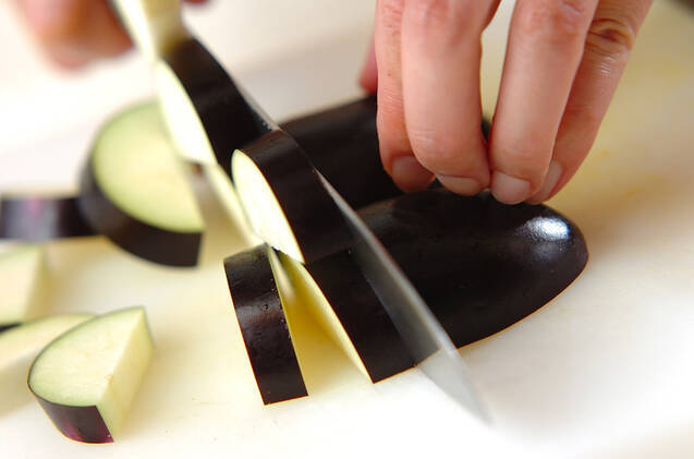 ナスはヘタを切り落として縦半分に切り、幅1cmの半月切りにする。