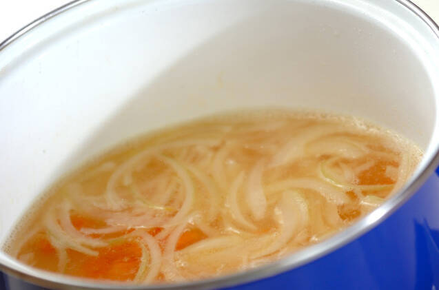 全体に炒められたら<スープ>の材料を加え、煮たったら火を弱め、野菜が柔らかくなるまで8~10分位煮る。