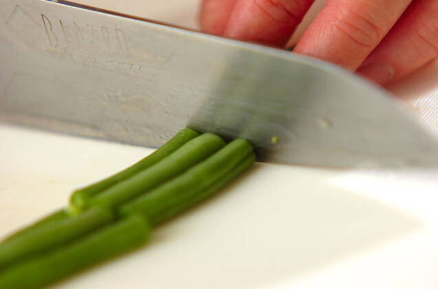 ササゲは水洗いして軸側を少し切り落とし、長さ3~4cmに切る。