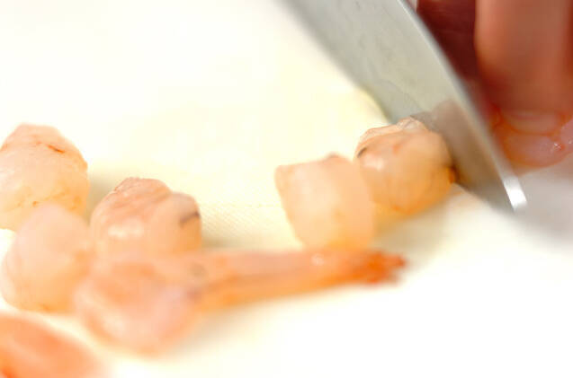 むきエビは背ワタを取り、分量外の塩でもんで水洗いし、ザク切りにする。