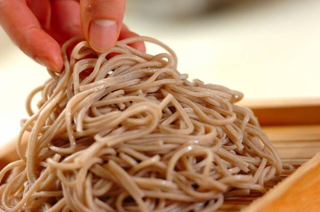 そばを表示通りにゆでる。そばがゆで上がったら冷水でしめ、水気をきって皿に盛り、(3)と<薬味>を添える。