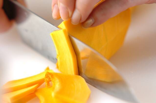 カボチャは種とワタを取り、皮を削ぎ落として薄切りにする。