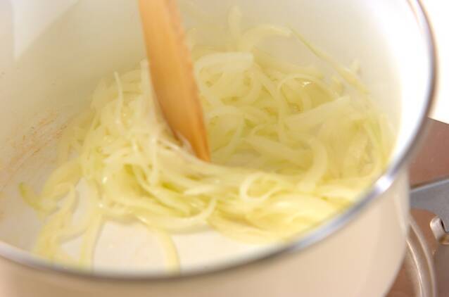 鍋にバターを熱し、玉ネギを入れてしんなりするまで炒める。