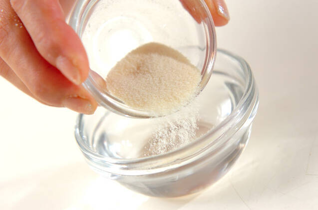 水大さじ3に粉ゼラチンを振り入れてふやかす。(ヒント)水にまんべんなく粉ゼラチンを振り入れることでダマになるのを防ぎ、あとで溶けやすくします。