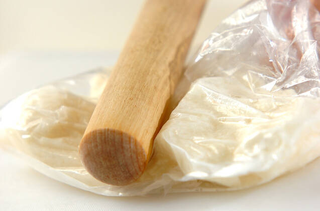 長芋は皮をむいてビニール袋に入れ、食べやすい大きさにたたきつぶす。