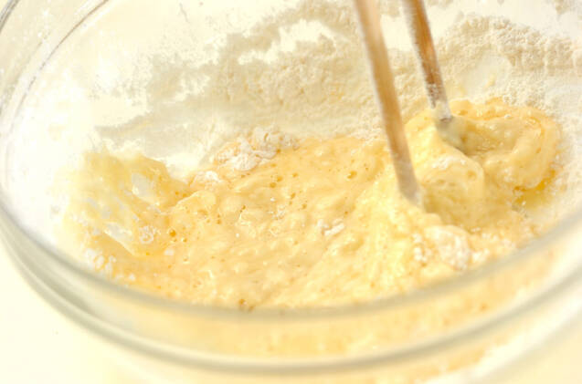 ボウルに<衣>の卵と冷水を混ぜ合わせ、網で振るいながら小麦粉を加え、ザックリと粉が残る程度に手早く混ぜる。