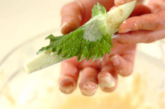 ナス、大葉に薄く小麦粉をからめる。大葉は片面に<衣>をつけ、ナスをはさむように巻く。さらに<衣>を通して170℃の揚げ油で揚げる。