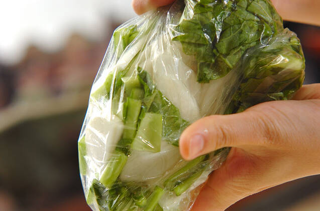 抗菌のビニール袋などにカブ、カブの葉、塩を加えて全体に塩をからめ、そのまま10分置く。