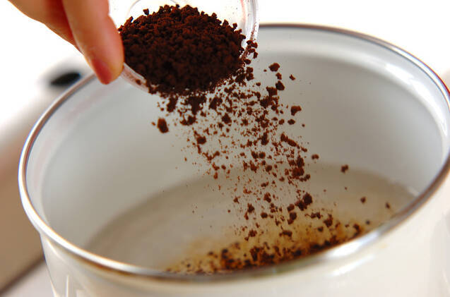 鍋に水200ml、インスタントコーヒーを入れて煮溶かす。きれいに溶けたら、ふやかしたゼラチンを加え、余熱で溶かす。