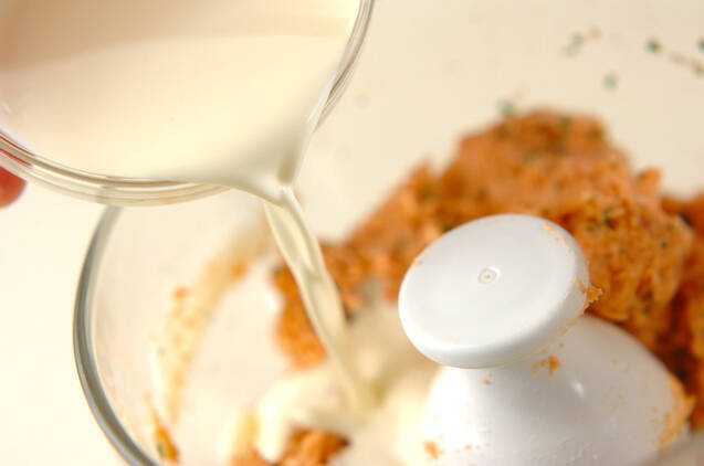 (2)が混ざったら、生クリームを少しずつ加えてかくはんし、さらにレモン汁を加えてかくはんする(時々、フードプロセッサーの周りに飛び散った中身をゴムベラで集めながらかくはんする)。なめらかになったら塩、コショウを加え混ぜる。