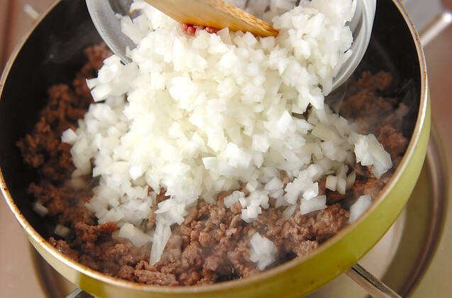 合びき肉はサラダ油でポロポロになるまで炒め、みじん切りにした玉ネギ、粗く刻んだ豚軟骨を加えて炒め合わせ、塩コショウで味を調える。