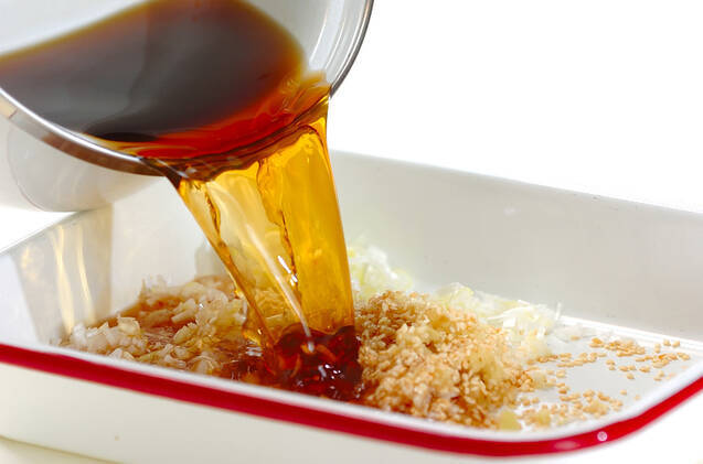 <南蛮ダレ>の白ネギはみじん切りにし、ショウガは皮をむきみじん切りにする。<南蛮ダレ調味料>を一煮立ちさせ、白ネギ等他の材料を加え混ぜておく。