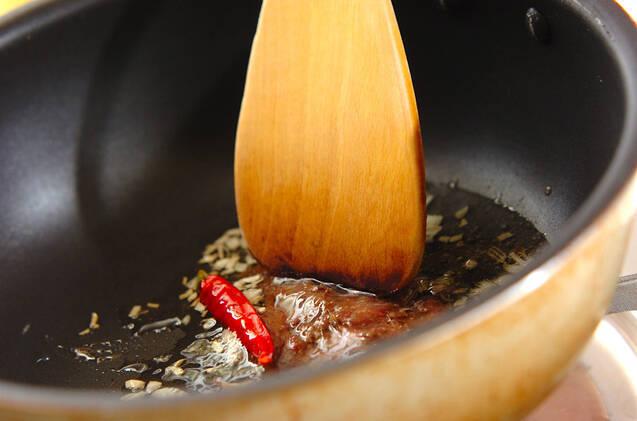 フライパンにオリーブ油、ニンニクを入れ、弱火で香りが出るまで炒める。アンチョビ、赤唐辛子を加えて炒めながら崩す。赤唐辛子は取り除く。
