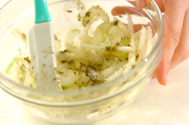 <ドレッシング>のボウルにセロリを加えて混ぜ合わせ、器に盛る。
