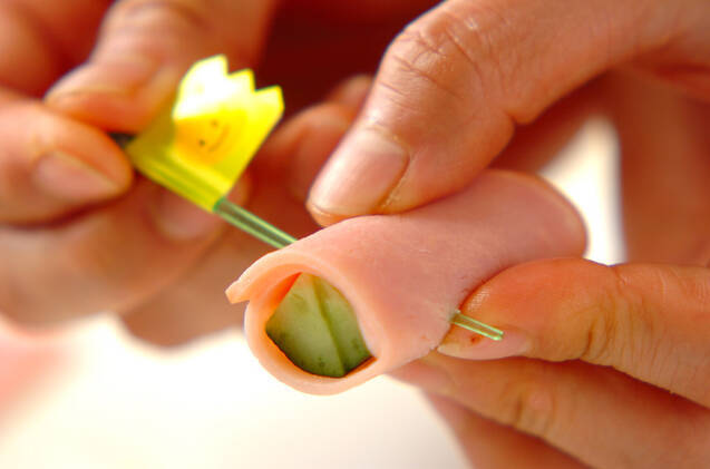 ハムは半分に切って(1)のキュウリを巻き、スティックで留める。もう一本作る。