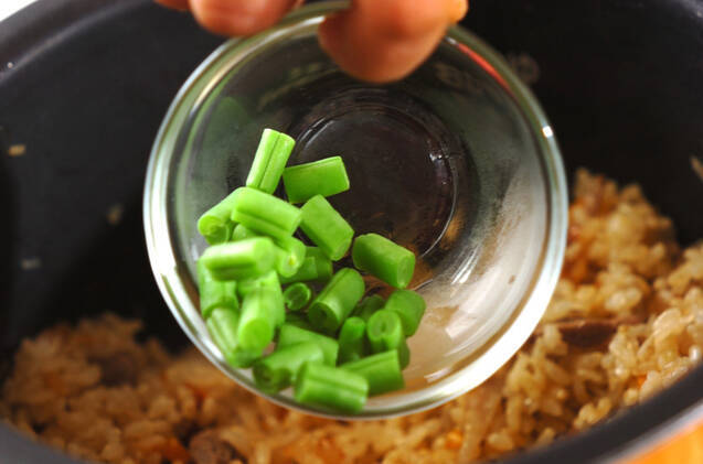 炊き上がったら10~15分蒸らし、余分な水分を飛ばすように、炊飯器の底から大きく返して混ぜる。最後にサヤインゲンを加えて混ぜ合わせ、器に盛る。