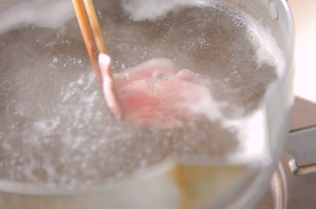 たっぷりの熱湯に豚シャブシャブ肉を1枚ずつ菜ばしではさんで泳がすようにゆで、色が変わったら冷水に取って、ザルに上げ、水気を切る。