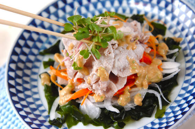 器にワカメとニンジン、新玉ネギを敷き、豚肉をのせて<白ゴマソース>を掛け、貝われ菜をのせる。