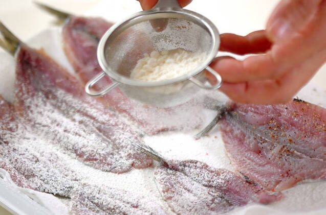 イワシに<衣>の小麦粉を薄くつけ、溶き卵、パン粉を順番につける。