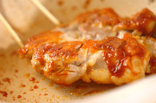 蓋を取って強火で水分を飛ばし、<調味料>を加える。鶏もも肉にからめながら焼き、食べやすい大きさに切って、白菜を盛った器に盛り合わせる。